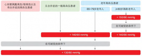 • 心血管风险高危/很高危的高血压患者以及有合并症的高血压患者,在可耐受的条件下,推荐诊室血压目标为<130/80 mmHg。