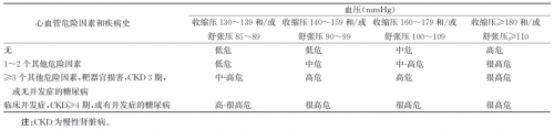 • 根据血压水平、心血管危险因素、靶器官损害、临床并发症以及糖尿病和CKD等合并症进行心血管危险分层,分为低危、中危、高危和很高危4个层次。