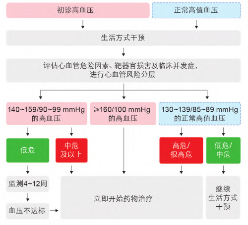 • 血压水平130-139/85-89 mmHg的正常高值人群,心血管风险为高危和很高危者应立即启动降压药物治疗。低危和中危者,目前没有证据显示可以从降压药物治疗中获益,此类人群应持续进行生活方式干预。